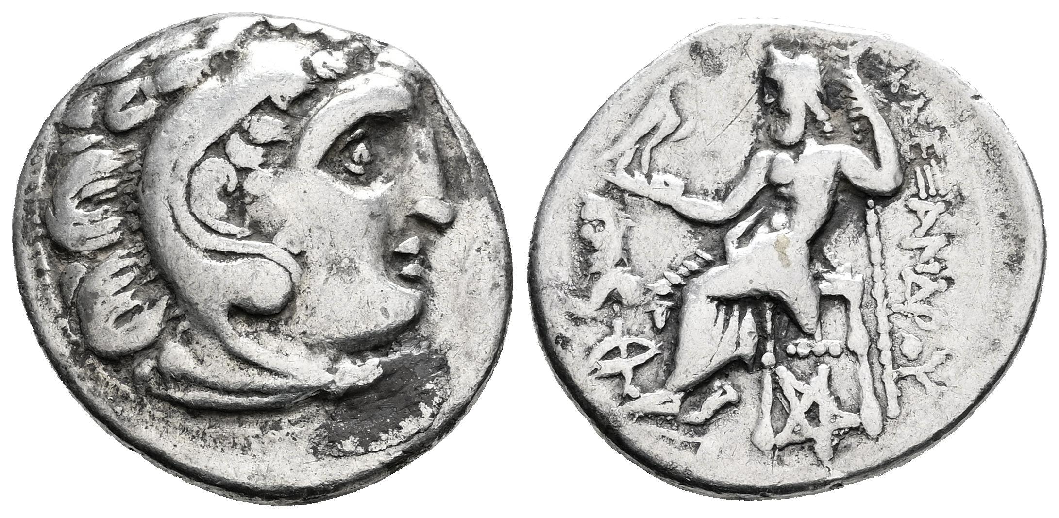 Kings of thracia. Lysimachos. Drachm. 301-297 BC. Kolophon. In the name and types of Alexander III of Macedon. (Price-1840). (Müller-357). Anv.: Head of Herakles to right, wearing lion skin headdress. Rev.: Zeus Aëtophoros seated to left, holding sceptre; AΛEΞANΔPOY to right, Φ below forepart of lion to left in left field, pentagram below throne. Ag. 4,12 g. Slight rust on obverse. Almost VF/Choice F. Est...100,00.