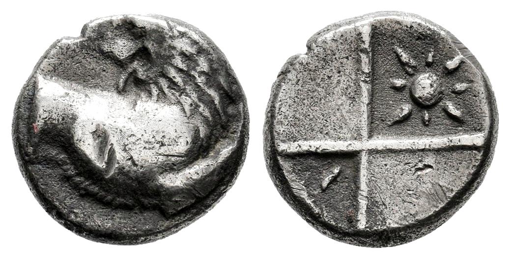 Thrace. Cherronesos. Hemidrachm. 400-350 BC. (Cng-III, 1437). Anv.: Forepart of lion right, head reverted. Rev.: Quadripartite incuse incuse square with alternating raised and sunken quarters; I and pellet in one sunken quarter, 8-rayed star in the other. Ag. 2,10 g. VF. Est...50,00.