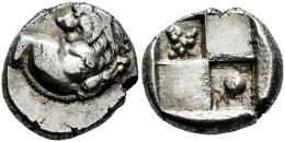 Thrace. Chersonesos. Hemidrachm. 357-320 BC. Kardia. (Bmc-11). (Weber-2419, 2434). (Hgc-3.2, 1437). Anv.: Forepart of lion to right, head reverted. Rev.: Quadripartite incuse square with alternating raised and sunken quarters; in two sunken quarters: pellet, bunch of grapes. Ag. 2,48 g. Choice VF/XF. Est...100,00.