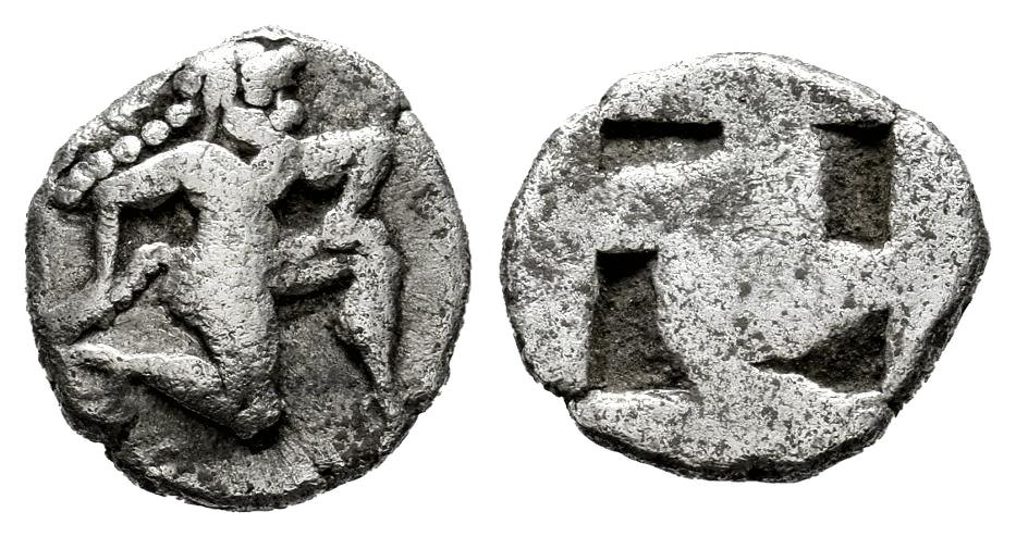 Thrace Islands. Thasos. Diobol. 500-463 BC. (Le Rider-Thasiennes 4). (Sng Cop-191/94). (Hgc-4, 333). Anv.: Satyr running to right. Rev.: Quadripartite incuse square. Ag. 1,00 g. Almost VF. Est...70,00.