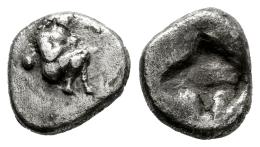 Thraco-Macedonian Region. Berge. Trihemiobol. 525-480 BC. (Svoronos-pl. 8, 11-13 (Lete)). (Sng Ans-969/70 (Lete)). (Hgc-3.1, 534 (Lete)). Anv.: Satyr crouching to right; two pellets flanking. Rev.: Quadripartite incuse square. Ag. 1,10 g. VF. Est...60,00.