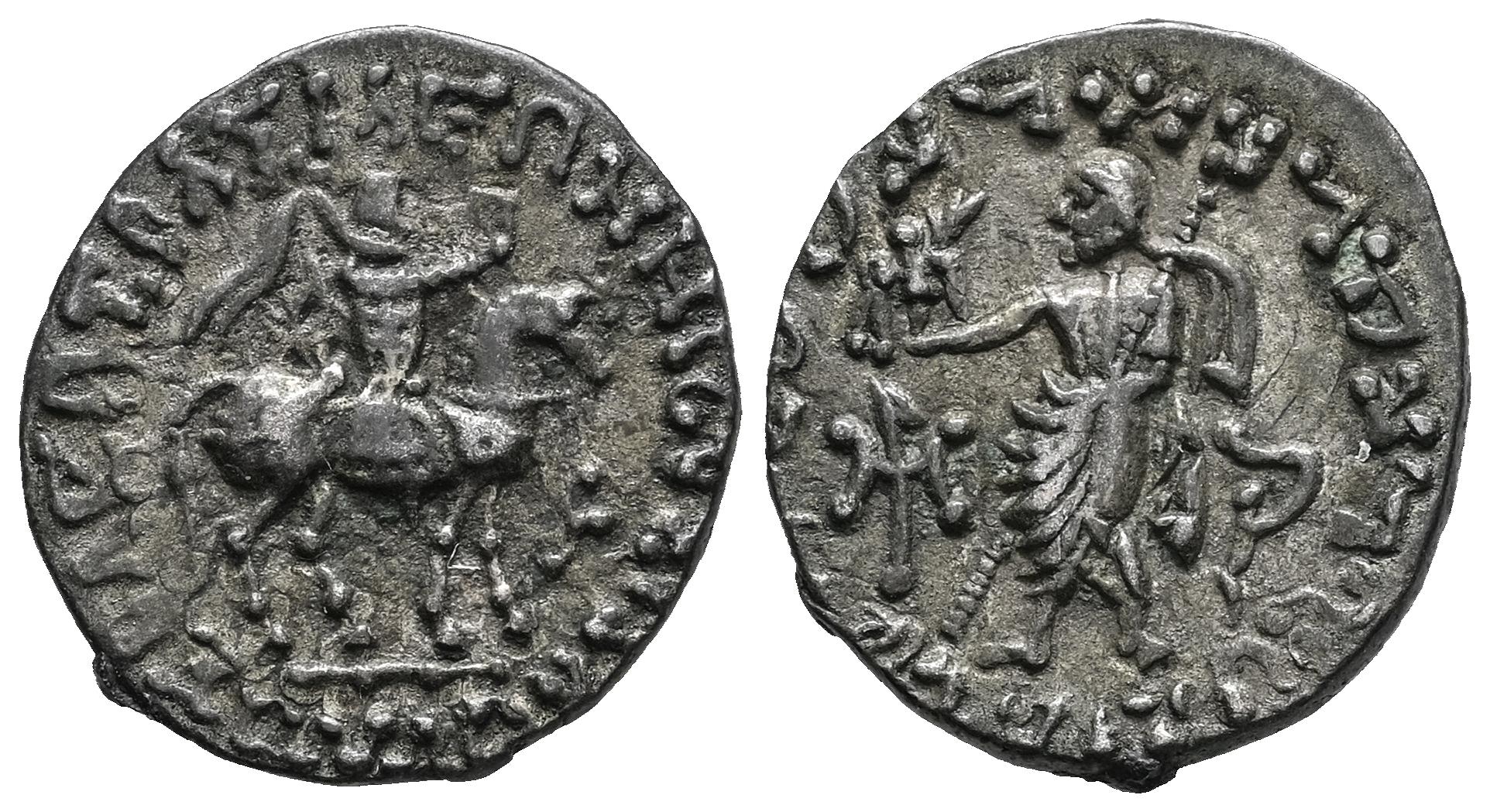 Indo-Skythians. Azes I. Drachm. 58-12 BC. (Senior-105.375D). (Hgc-12, 655). Anv.: Azes on horseback to right, wearing cataphractus and holding whip aloft; Karosthi letter before horse. Rev.: Zeus Nikephoros standing to left, holding transverse sceptre; monogram to left, Karoshthi letter to right. Ag. 2,40 g. A good sample for this type. Slight patina. Choice VF. Est...120,00.