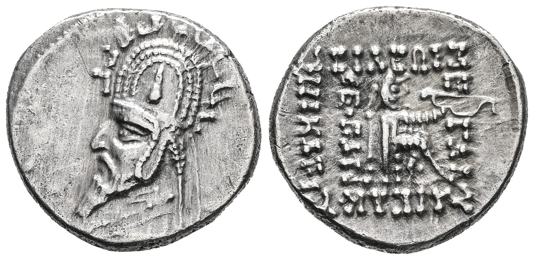 Kingdom of Parthia. Sinatrukes. Drachm. 93-70 BC. Rhagai. (Sellwood-33.3). Anv.: Bust left, wearing tiara decorated with horn and stags. Rev.: Archer (Arsakes I) seated right on throne, holding bow. Ag. 4,08 g. Choice VF. Est...110,00.