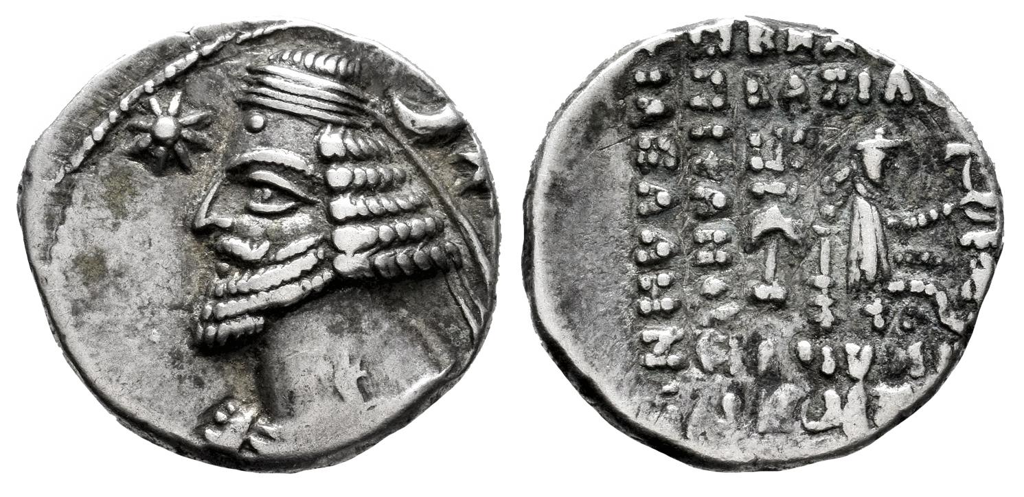 Kingdom of Parthia. Orodes II. Drachm. 57-38 BC. Ekbatana. (Sellwood-48.9). (Sunrise-381). Anv.: Diademed and draped bust to left; star to left, crescent above star to right. Rev.: ΒΑΣΙΛΕΩΣ ΒΑΣΙΛΕΩΝ ΑΡΣΑΚΟΥ ΕΥΕΡΓΕΤΟΥ ΔΙΚΑΙΟΥ ΕΠΙΦΑΝΟΥΣ ΦΙΛΕΛΛΗΝΟΣ, archer (Arsakes I) seated to right on throne, holding bow; monogram below bow; anchor symbol behind throne. Ag. 4,03 g. VF/Almost VF. Est...60,00.