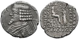 Kingdom of Parthia. Phraates IV. Tetradrachm. 38/7-2 BC. Seleukeia on the Tigris. (Sellwood-51.4). (Sunrise-388). Anv.: Diademed bust to left. Rev.: BAΣIΛEΩC BAΣIΛEΩN ΛPΣAKOY EYEPΓETOY ΔIKAIOY EΠIΦΛNOYΣ ΦIΛEΛΛHNOΣ, Phraates seated to right, receiving palm from Tyche standing to right, holding cornucopiae; uncertain date in exergue. Ag. 10,14 g. Graffiti on obverse. Ex Tauler & Fau 149 (01/10/2024), lot 2170. Choice VF/VF. Est...200,00.