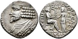Kingdom of Parthia. Vardanes I. Tetradrachm. SE 353 = 42 AD. Seleukeia on the Tigris. (Sellwood-64.2-10). Anv.: Diademed bust to left. Rev.: Vardanes seated to right, receiving palm frond from Tyche standing to left, holding cornucopiae; ΓNT (year) above, [month] in exergue. Ag. 14,34 g. Soft tone. Almost XF. Est...200,00.