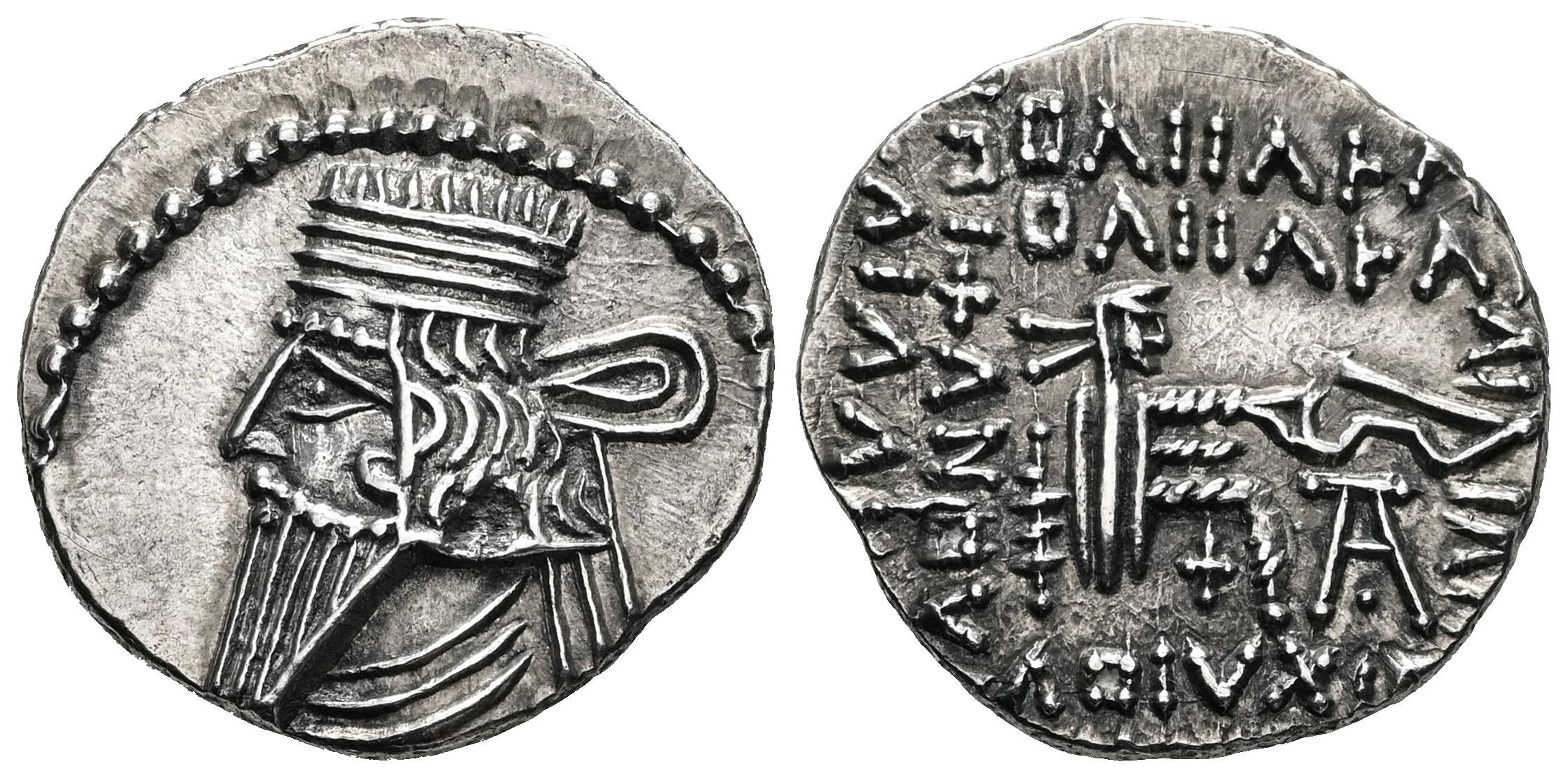 Kingdom of Parthia. Pakoros I. Drachm. 78-120 AD. Ekbatana. (Sellwood-78.3 (Vologases III)). (Shore-413 (Vologases III)). (Sunrise-439). Anv.: Diademed head to left, with long beard. Rev.: Archer (Arsakes I) seated to right, no throne base visible, holding bow; monogram below bow. Ag. 3,79 g. AU. Est...120,00.