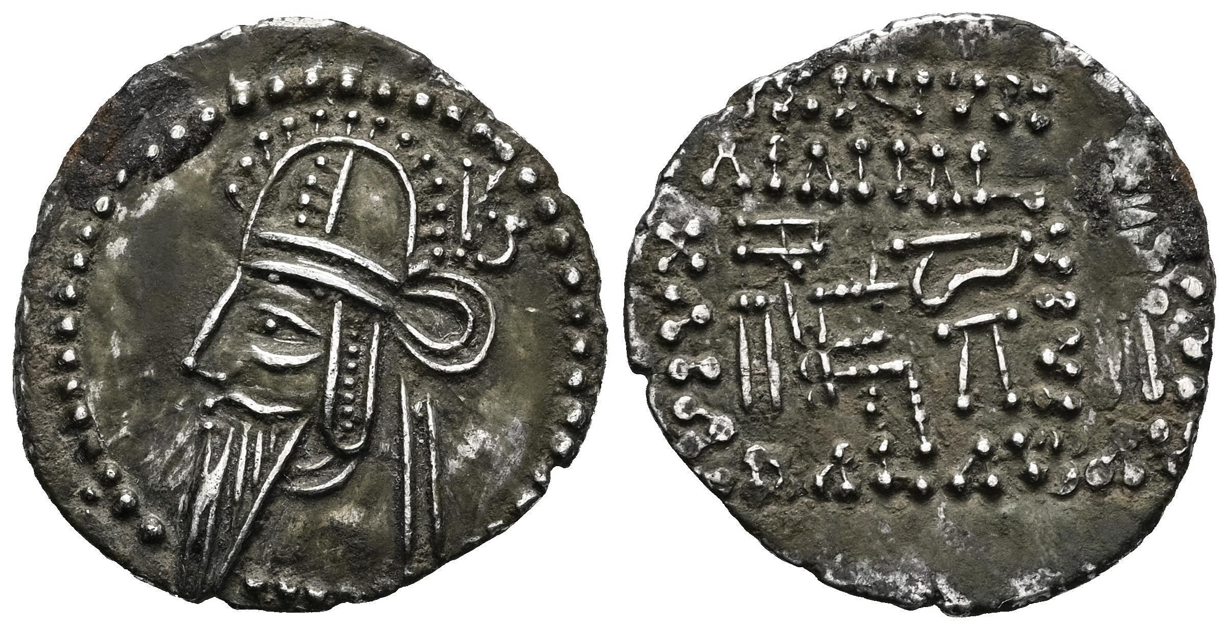 Kingdom of Parthia. Vologases VI. Drachm. 208-228 AD. Ekbatana. (Sellwood-88.18). (Shore-456). (Tesorillo-Partia 14). Anv.: Diademed and draped bust of Vologases VI to left, wearing tiara. Rev.: Archer (Arsakes I) seated right on throne, holding bow; below bow, monogram. Ag. 3,79 g. Patina. XF. Est...110,00.