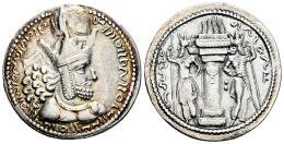Sassanid Empire. Shapur I. Drachm. 260-272 AD. Mint III ("Hamadan"). (Göbl-I/1). (SNS-IIc/1a, type A). (Sunrise-732 var.). Anv.: Diademed and draped bust of Shapur I to right, wearing mural crown with a great korymbos on top and long earflaps; long beard tied in the middle and thick tufts of curly hair at the back; two ribbons rising from behind head. The legend along the dotted rim, running anticlockwise from 11 h to 1 h, reads ‘mzdysn bgy šhpwhry MRKAn MRKA ʾyrʾn MNW ctry MN yzdʾn’ = ‘mazdēsn bay Šābuhr šāhān šāh Ērān kē čihr az yaz(a)dān’ (‘The Mazda-worshipping Lord Shapur, King of Kings of the Iranians, whose essence is from the gods’ in Pahlavi). Rev.: Zoroastrian fire altar flanked by two regal attendants wearing mural crowns and holding scepters, Two pellets to right; to left and right, ‘NWRA ZY - šhpwhry’ = ‘ādur ī Šābuhr’ (‘Fire of Shapur’ in Pahlavi). Ag. 4,33 g. Slightly cleaned with slight iridescent tone. Ex Pars Coins, Vcoins (19/05/2017). Included original label. Choice VF. Est...200,00.