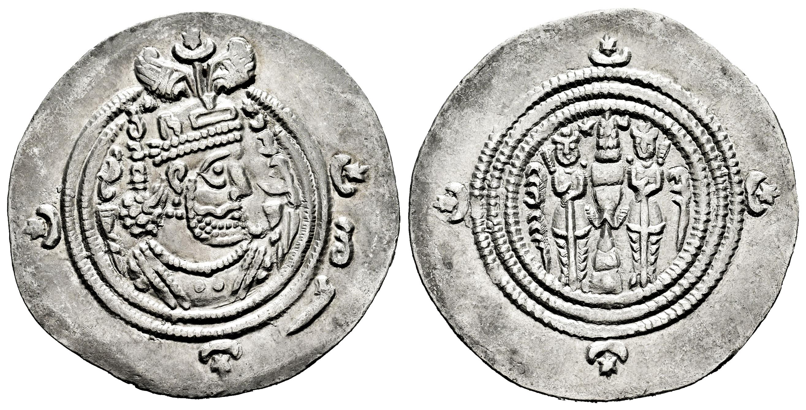 Sassanid Empire. Khusro II. Drachm. RY 33 = 623/24 AD. DA (Darabgird). (Göbl-II/3). Anv.: Draped bust of Khosrau II to right, wearing an elaborate mural crown; behind head, 'GDE / ʾp̄zwt'' ('[may his] glory increase' in Pahlavi); before head, 'hwslwb' = 'Husraw' ('Khosrau' in Pahlavi); in the outer margin, 'ʾp̄d' = 'abd' ('wonderful' in Pahlavi). Rev.: Fire altar with ribbons, flanked by two attendants; above altar, star and crescent; to left, date in Pahlavi; to right, DA ('Darabgird' in Pahlavi). Ag. 4,12 g. Almost XF/XF. Est...80,00.