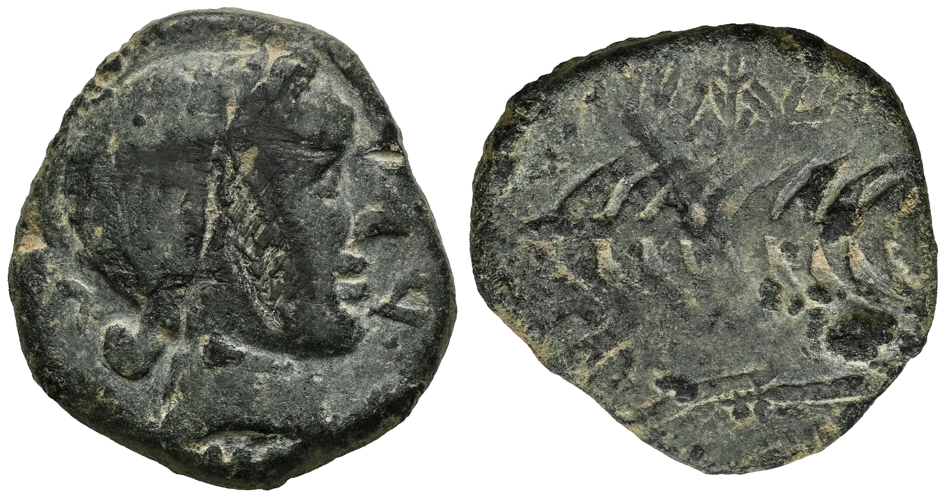 Abra. Unit. 120-20 BC. Porcuna (Jaén). (Abh-27). (MIB-163/1b). (Acip-2278). Anv.: Female head right, iberian legend OTUBOTUKI around. Rev.: Ear of corn, inverted plow, circular iberian legend TAKISNIS above. Ae. 15,89 g. Minor scratches on obverse. Scarce. Choice F. Est...120,00.