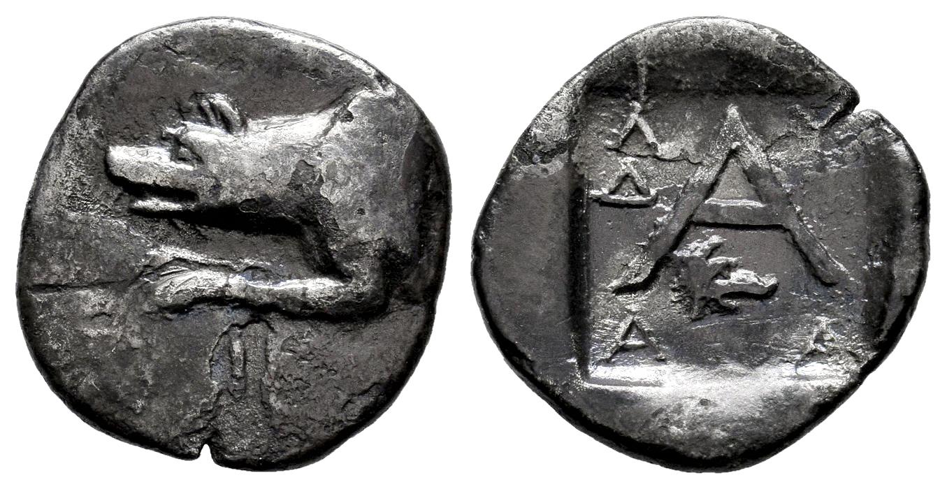 Argolis. Argos. Triobol. 80-50 BC. Lydiadas, magistrate. (Bmc-116). (McClean-6850). (BCD-Peloponnesus 1174). Anv.: Forepart of wolf to left. Rev.: Large A; magistrate’s name Λ - Y / A(Δ)A across field, boar’s head right below; all within incuse square. Ag. 2,14 g. Beautiful patina. Almost VF. Est...70,00.