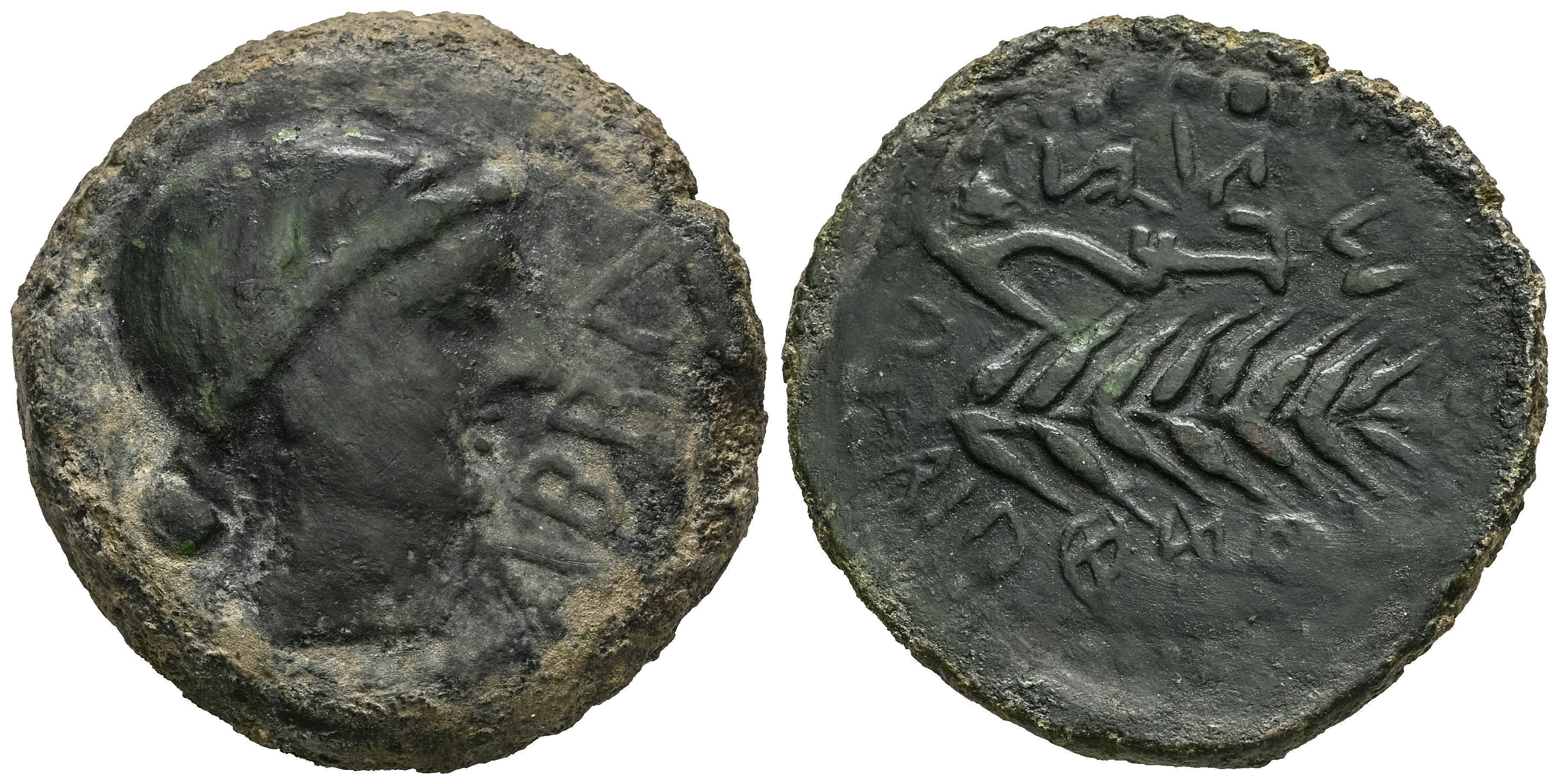 Abra. Unit. 120-20 BC. Porcuna (Jaén). (Abh-Unlisted). (MIB-163/2a). (Acip-2279). Anv.: Female head to the right, with a hairstyle finished in a bun and with a neck, in front ABRA. Rev.: Plow and spike to the right, circular legend uekoeki +kioniś to the left. Ae. 21,33 g. Rare. Tooled and smoothed. Artificial patina. Almost VF/VF. Est...150,00.
