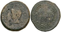 Acci. Time of Tiberius. Dupondius. 14-36 AC. Guadix (Granada). (Abh-38). (Acip-3006). (Tesorillo-Type 4/13). Anv.: TI.CAE-SAR. DIVI. AVG. F. AVGVSTVS. Laureate head of Tiberius left. Rev.: COL. IVG. GEM. ACCI within laureal wreath. Ae. 26,44 g. Countermark C·A incised on the obverse. Double strike. Rare. Almost VF. Est...200,00.