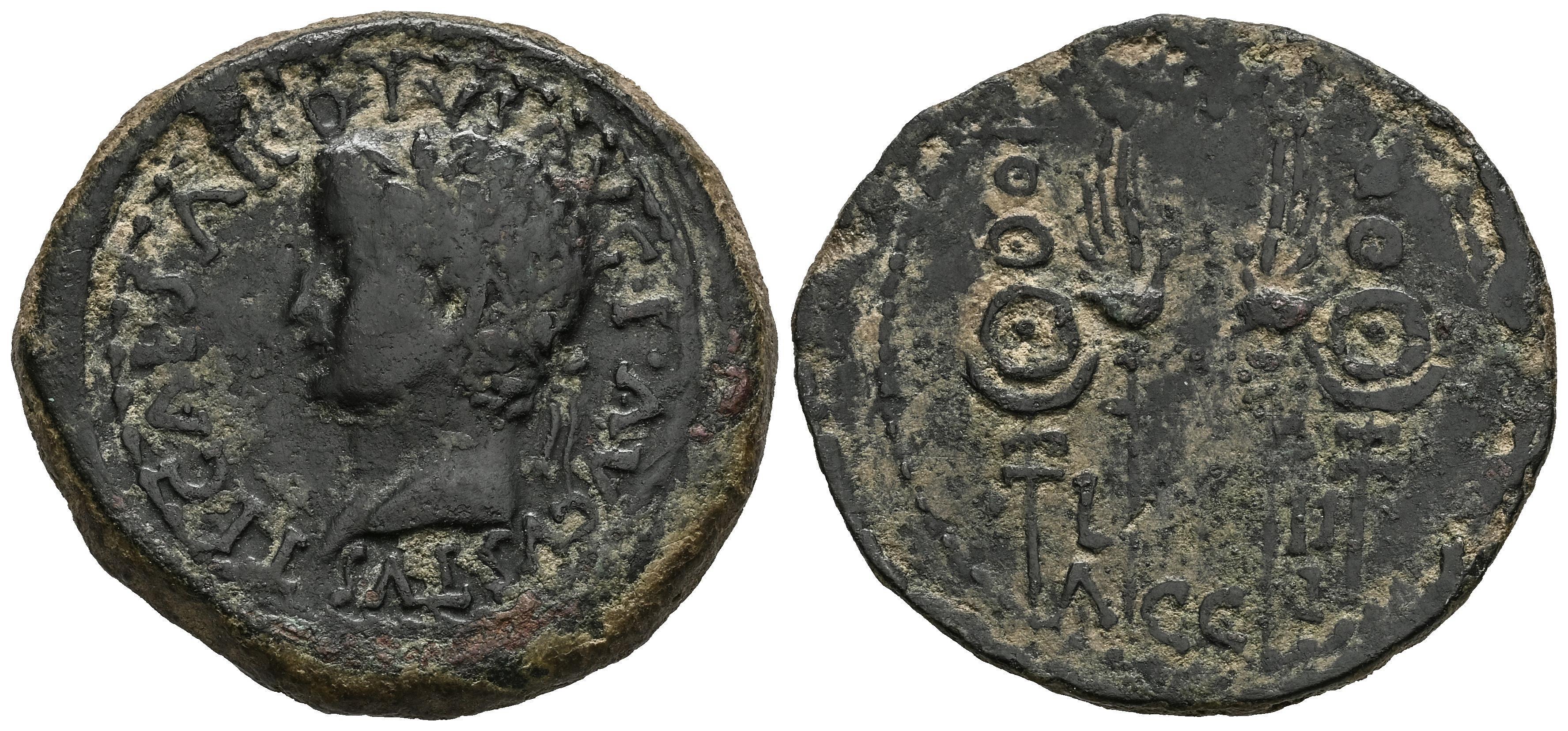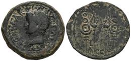 Acci. Time of Tiberius. Unit. 14-36 AC. Guadix (Granada). (Abh-39). (Acip-3007). Anv.: TI. CAESAR. DIVI. AVG. F. AVGVSTVS. Laureate head of Tiberius left. Rev.: Legionary eagles and ensigns, L. II. between them and legend C.I.G. ACCI. Ae. 12,23 g. Ex Giessener Münzhandlung Dieter Gorny GmbH (1990s). Included original label. Choice VF/VF. Est...120,00.