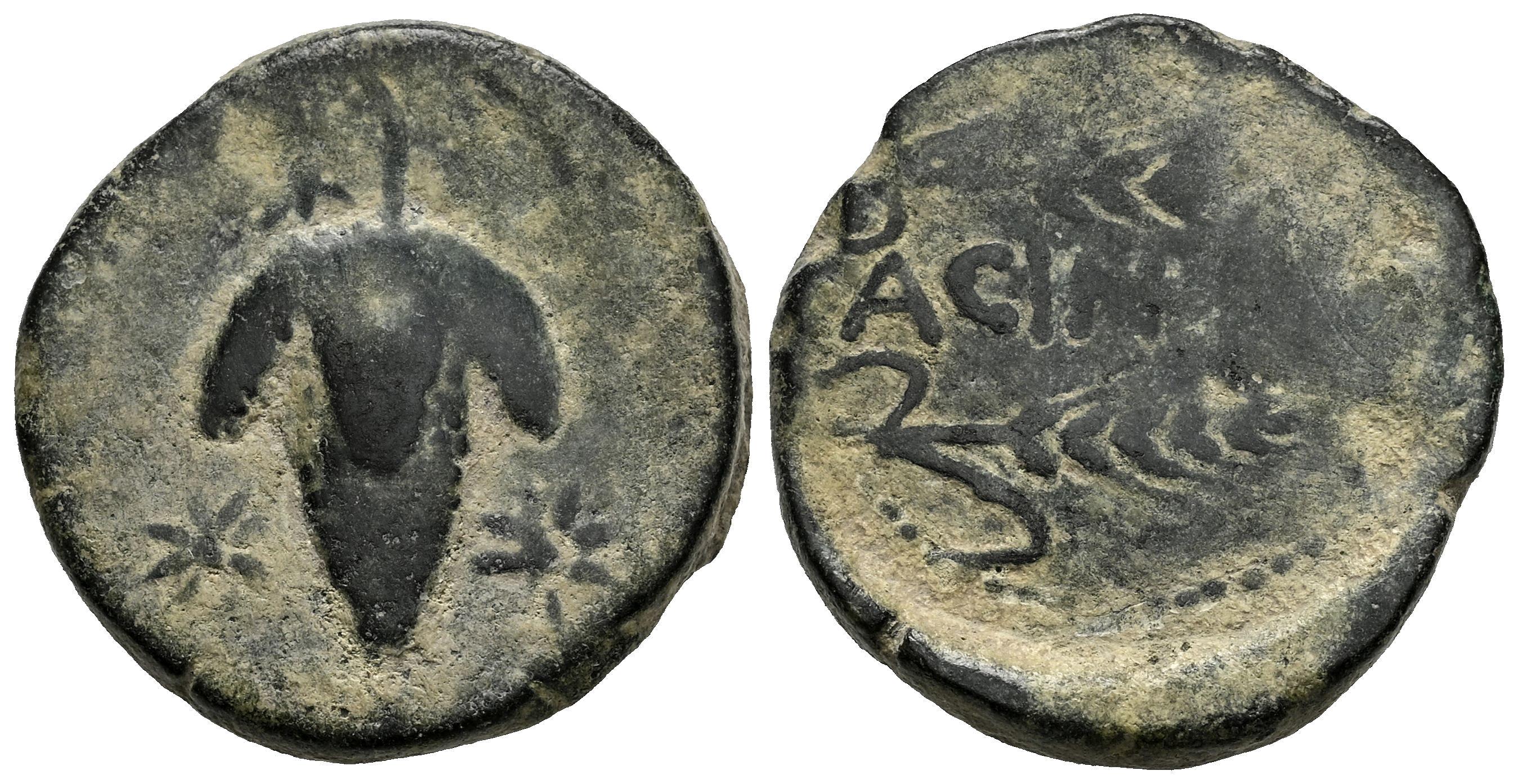 Acinipo. Unit. 100-50 BC. Ronda (Málaga). (Abh-56). (MIB-Unlisted). Anv.: Bunch of grapes, three stars around. Rev.: Two ears of corn, legend ACIN(IPO). Ae. 9,43 g. Rare. VF/Almost VF. Est...100,00.