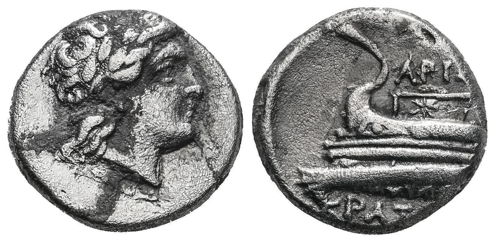 Bithynia. Kios. Hemidrachm. 340-330 BC. Aristokrates magistrate. (Sng Cop-376/9 var.). (Klein-244 var.). Anv.: Laureate head of Apollo right. Rev.: APIΣTO / KPATHΣ. Prow of a galley left, decorated with a star.. Ag. 2,46 g. Rust on obverse. Only two examples in Acsearch. Rare. Almost VF/VF. Est...120,00.