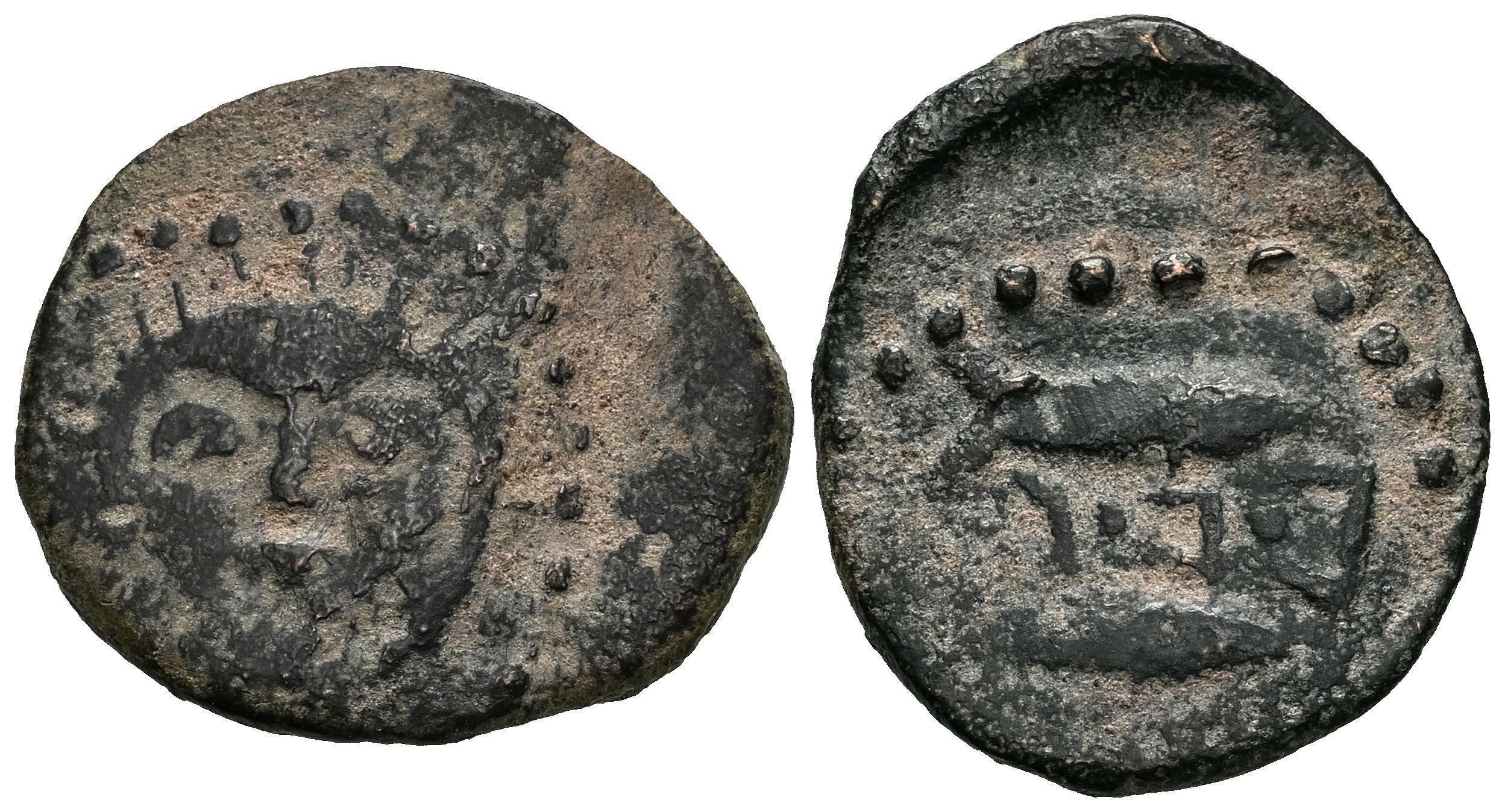 Asido. Half unit. 50 BC. Medina Sidonia (Cádiz). (Abh-155). (MIB-17/09). (Acip-920). Anv.: Facing head of Hercules, with lion skin. Rev.: Two tunny right, Libyan-Phoenician legend between them. Ae. 4,15 g. Very rare. Almost VF. Est...120,00.