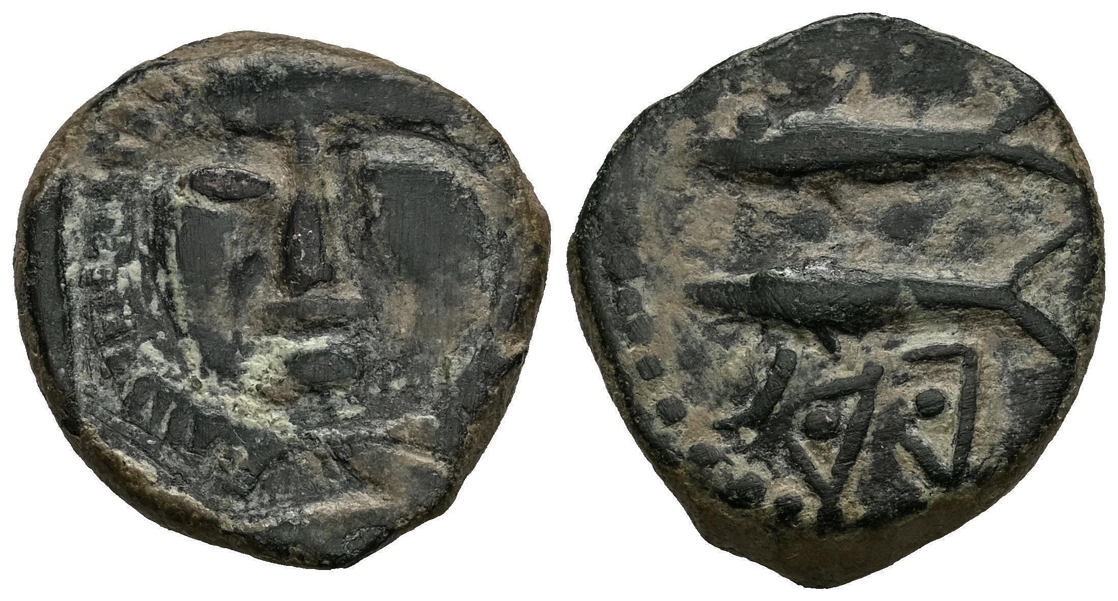 Asido. Half unit. 50 BC. Medina Sidonia (Cádiz). (Abh-156). (MIB-17/08). (Acip-919). Anv.: Facing fead of Hercules, with lion skin. Rev.: Two tunny left, Libyan-Phoenician legend below. Ae. 5,00 g. VF. Est...120,00.
