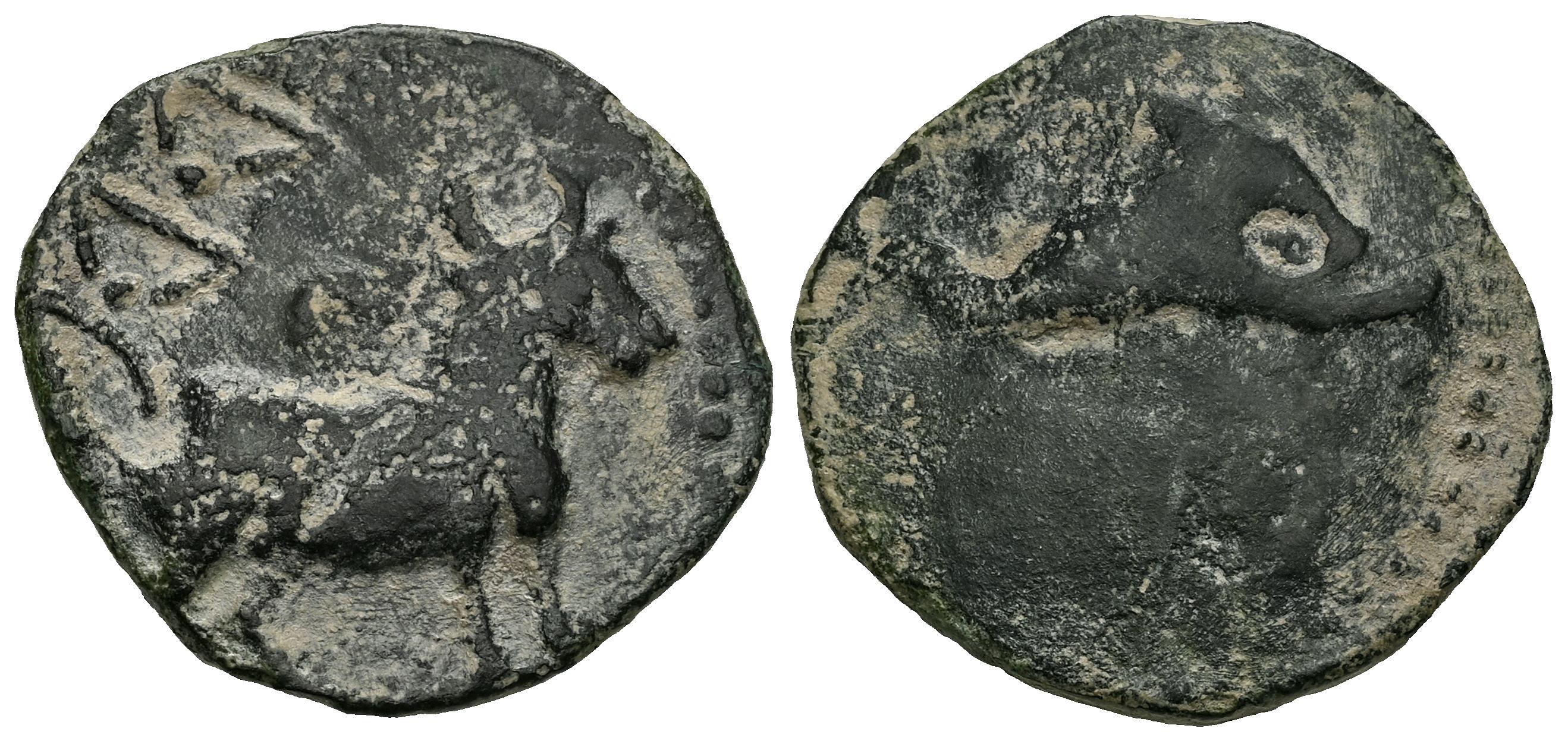 Asido. Half unit. 50 BC. Medina Sidonia (Cádiz). (Abh-157). Anv.: Bull right, crescent above and Libyan-Phoenician legend. Rev.: Dolphin right. Ae. 5,12 g. This type was erroneously cataloged by A. Burgos, who interpreted the upper legend on the obverse as belonging to the coin itself, when in reality it is a countermark. Countermark b‘b‘l (translated as “of the citizens”) on the obverse (MIB 436/102; Tesorillo 4/10). Very rare. VF/Almost VF. Est...100,00.
