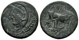 Bailo. Unit. 50 BC. Tarifa (Cádiz). (Abh-184). (MIB-19/6a). (Acip-927/8). Anv.: Head of Hercules left, ear of corn behind. Rev.: Bull left, A. BAILO above, Q. MANL. P. CORN below. Ae. 12,47 g. Countermarks of difficult attribution on the reverse. Very rare. Almost VF. Est...200,00.