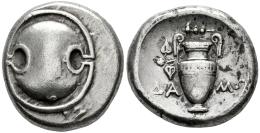Boiotia. Thebes. Stater. 390-382 BC. Damo- magistrate. (BCD Boeotia-490). (Bmc-129). (Hgc-4, 1330). Anv.: Boiotian shield. Rev.: Amphora, with ivy-spray hanging from left handle; club above, ΔA-MΩ across fields; all within incuse circle. Ag. 12,10 g. Almost XF/Choice VF. Est...800,00.