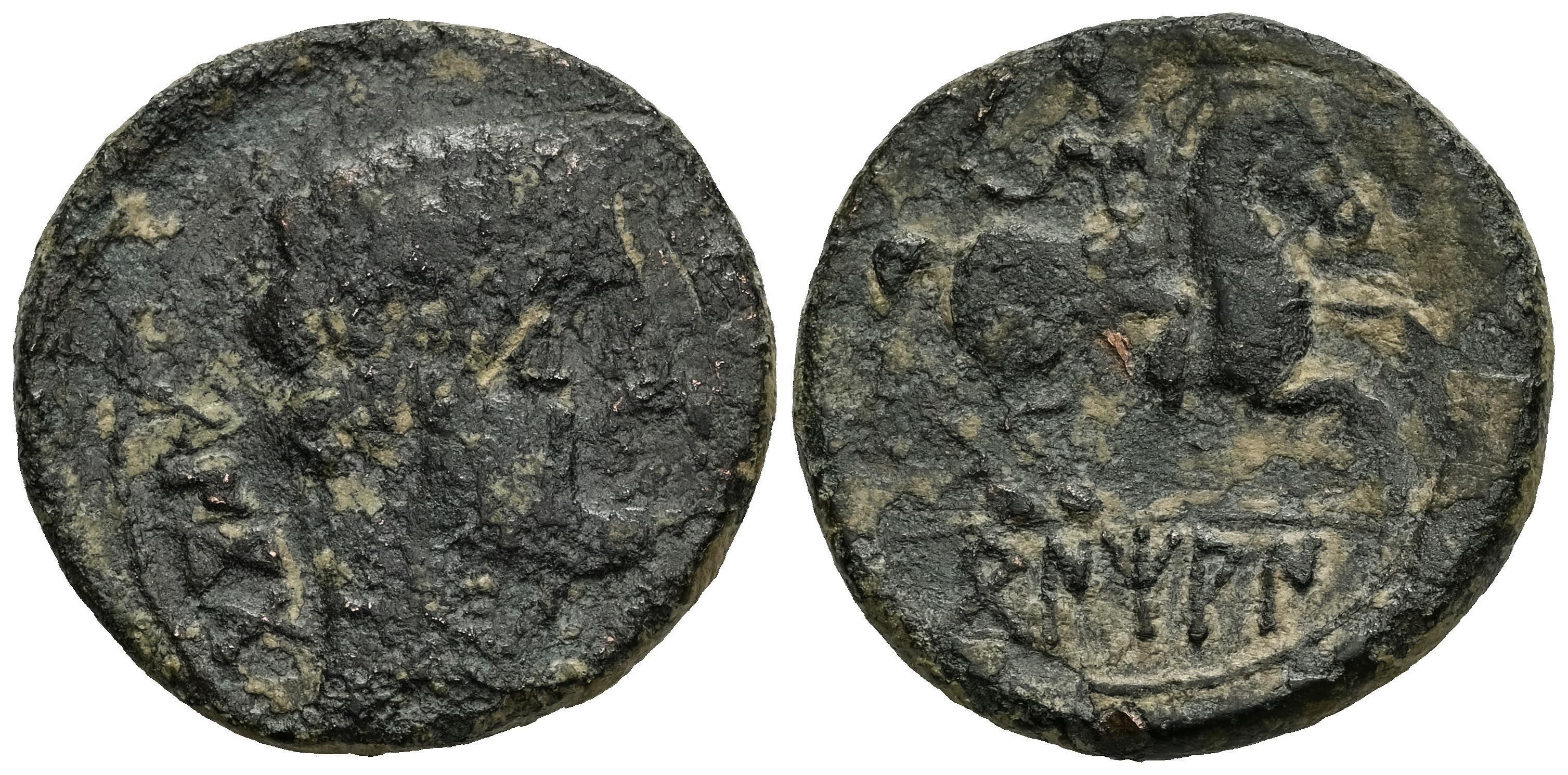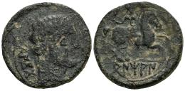 Bentian. Unit. 120-80 BC. Area of Navarra. (Abh-250). (MIB-89/4). (Acip-1678). Anv.: Male head right, dolphin before, iberian legend BENKODA behind. Rev.: Horseman right, holding spear, iberian legend BENTIAN below. Ae. 9,39 g. Almost F/Almost VF. Est...100,00.