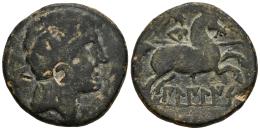 Bilbilis. Unit. 120-30 BC. Calatayud (Zaragoza). (Abh-254). (Tesorillo-Type 2/18). Anv.: Male head right, dolphin before, iberian letter S behind. Rev.: Horseman right, holding spear, iberian legend BILBILIS below. Ae. 12,61 g. Countermark "Crescent within a circle" on obverse. Scarce. F/Choice F. Est...70,00.