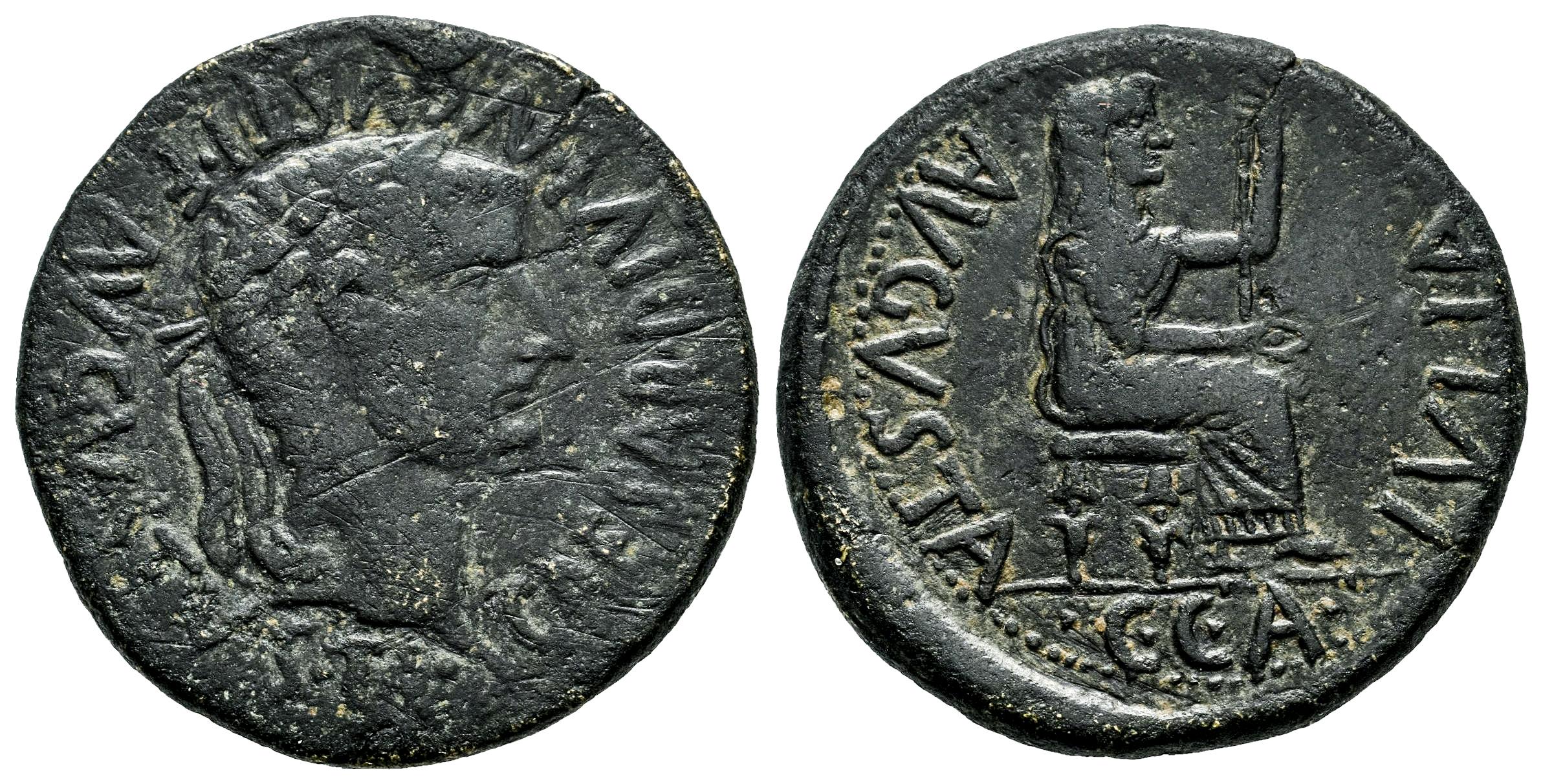 Caesaraugusta. Time of Tiberius. Unit. 14-36 AD. Zaragoza. (Abh-350). (Acip-3067a). Anv.: TI. CAESAR. DIVI. AVGVSTI. F. AVGVSTVS. around laureate head of Tiberius right. Rev.: Livia seated right, C.C.A. AVGVSTA. IVLIA around. Ae. 11,83 g. Hairlines on obverse. Very scarce. VF. Est...200,00.
