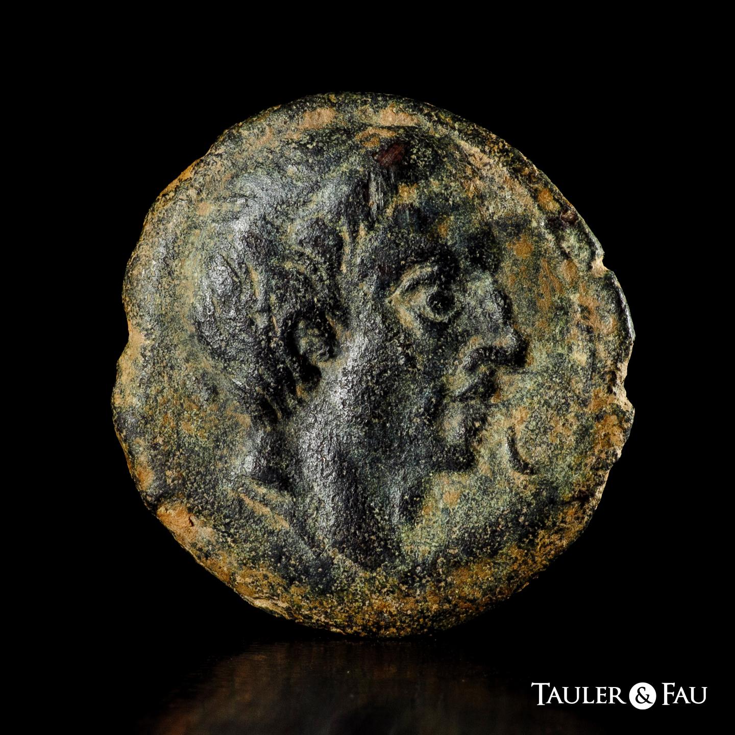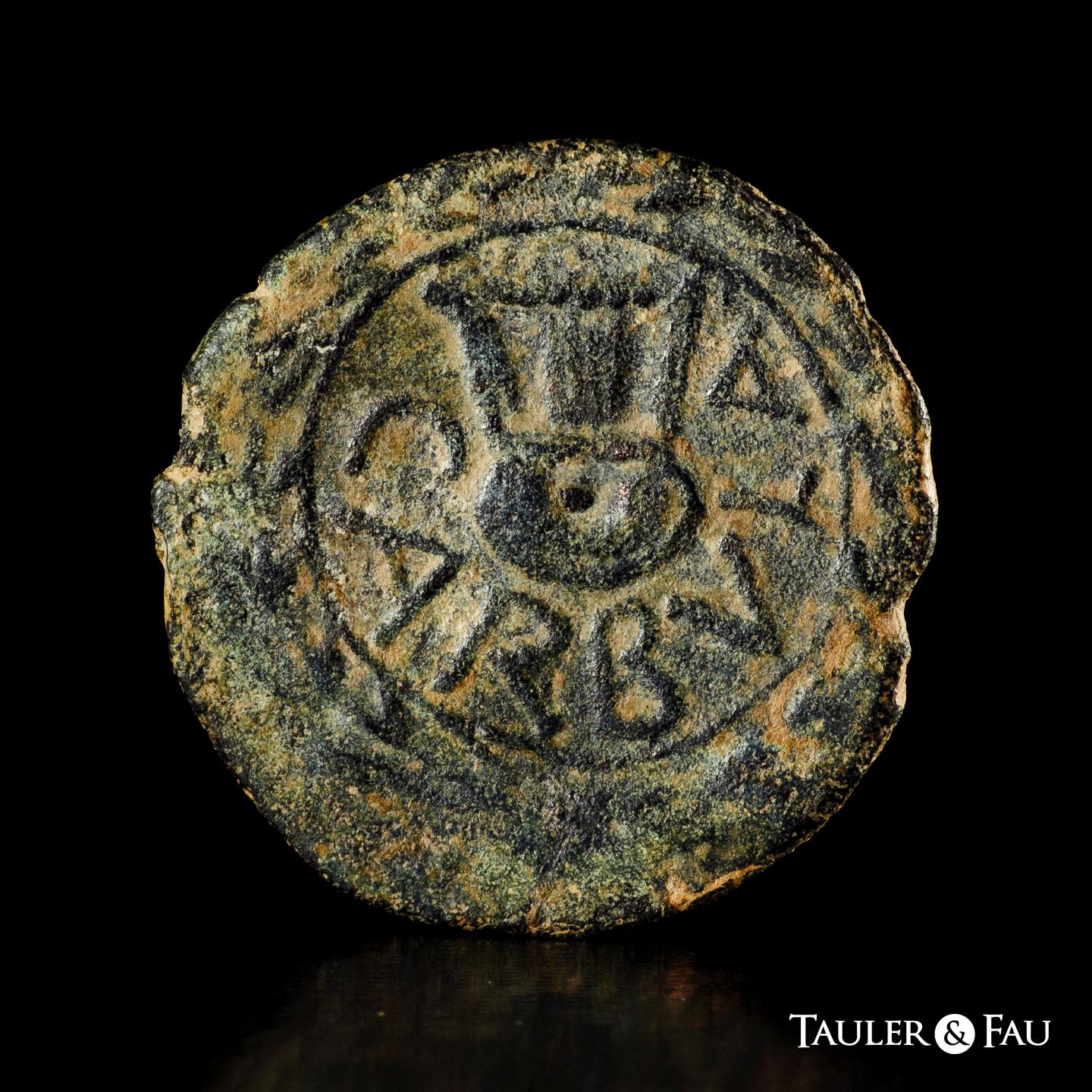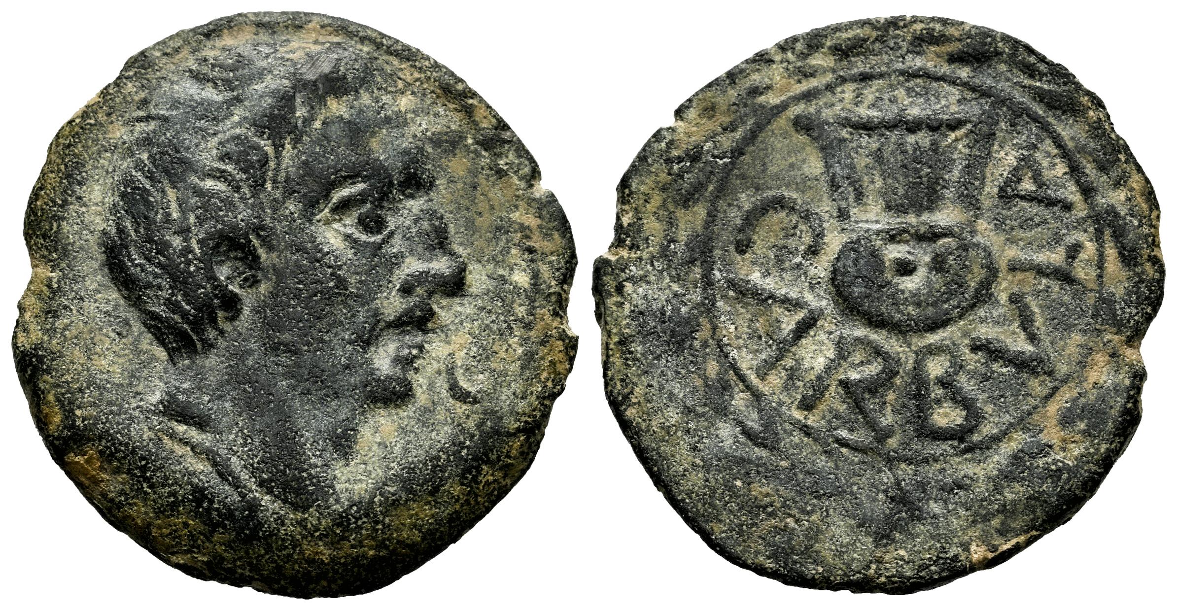 Carbula. Unit. 80 BC. Almodovar del Rio (Cordoba). (Abh-439). (MIB-210/1). (Acip-2311). Anv.: Male head right, iberian letter TA behind and "snake"? before. Rev.: Lyre and legend CARBVLA within laurel wreath. Ae. 11,89 g. Rare. Choice VF. Est...200,00.