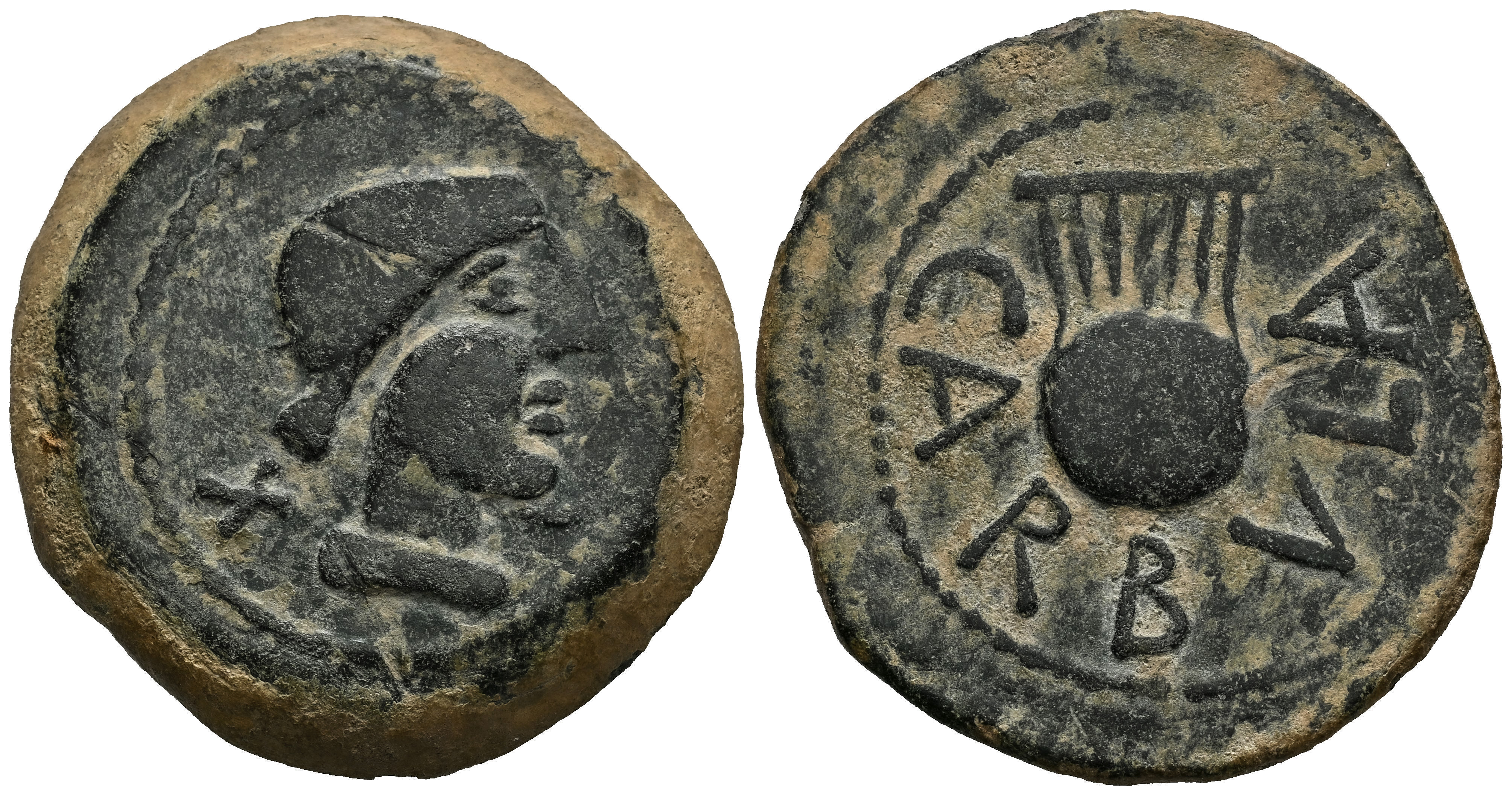 Carbula. Unit. 80 BC. Almodovar del Rio (Cordoba). (Abh-440). (MIB-210/2). (Acip-2312). Anv.: Head of Apollo right, iberian letter TA behind and snake (?) before. Rev.: Lyre and legend CARBVLA. Ae. 28,51 g. VF. Est...100,00.