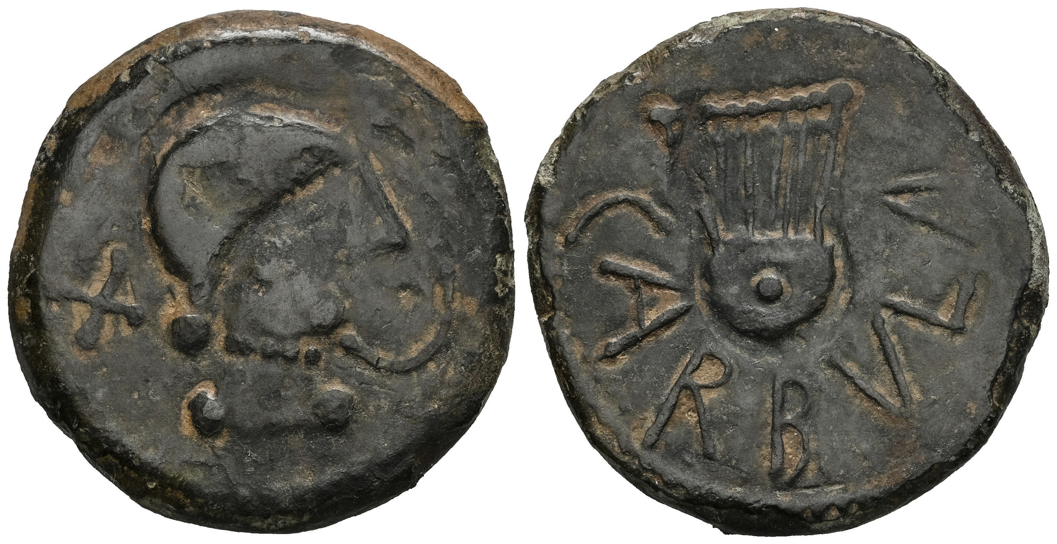 Carbula. Unit. 80 BC. Almodovar del Rio (Cordoba). (Abh-440). (MIB-210/2 var.). (Acip-2312 var.). Anv.: Head of Apollo right, iberian letter TA behind and snake (?) before. Rev.: Lyre and legend CARBVLA. Ae. 14,35 g. Almost VF/Choice VF. Est...120,00.