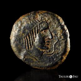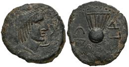 Carbula. Unit. 80 BC. Almodovar del Rio (Cordoba). (Abh-444). (MIB-210/4). (Acip-2314). Anv.: Head of Apollo right with vertical locks, iberian letter TA behind and snake (?) before. Rev.: Lyre and legend CARBVLA. Ae. 16,27 g. Choice VF. Est...120,00.