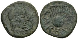 Carbula. Unit. 80 BC. Almodovar del Rio (Cordoba). (Abh-444). (MIB-210/4). (Acip-2314). Anv.: Head of Apollo right with vertical locks, iberian letter TA behind and snake (?) before. Rev.: Lyre and legend CARBVLA. Ae. 11,99 g. Almost VF. Est...70,00.