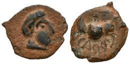Carisa. Half unit. 50 BC. Bornos (Cádiz). (Abh-448 var.). Anv.: Laureate male head right. Rev.: Horseman right, holding round shield and spear, inverted legend CAЯЯi below. Ae. 2,30 g. Scarce. VF. Est...50,00.