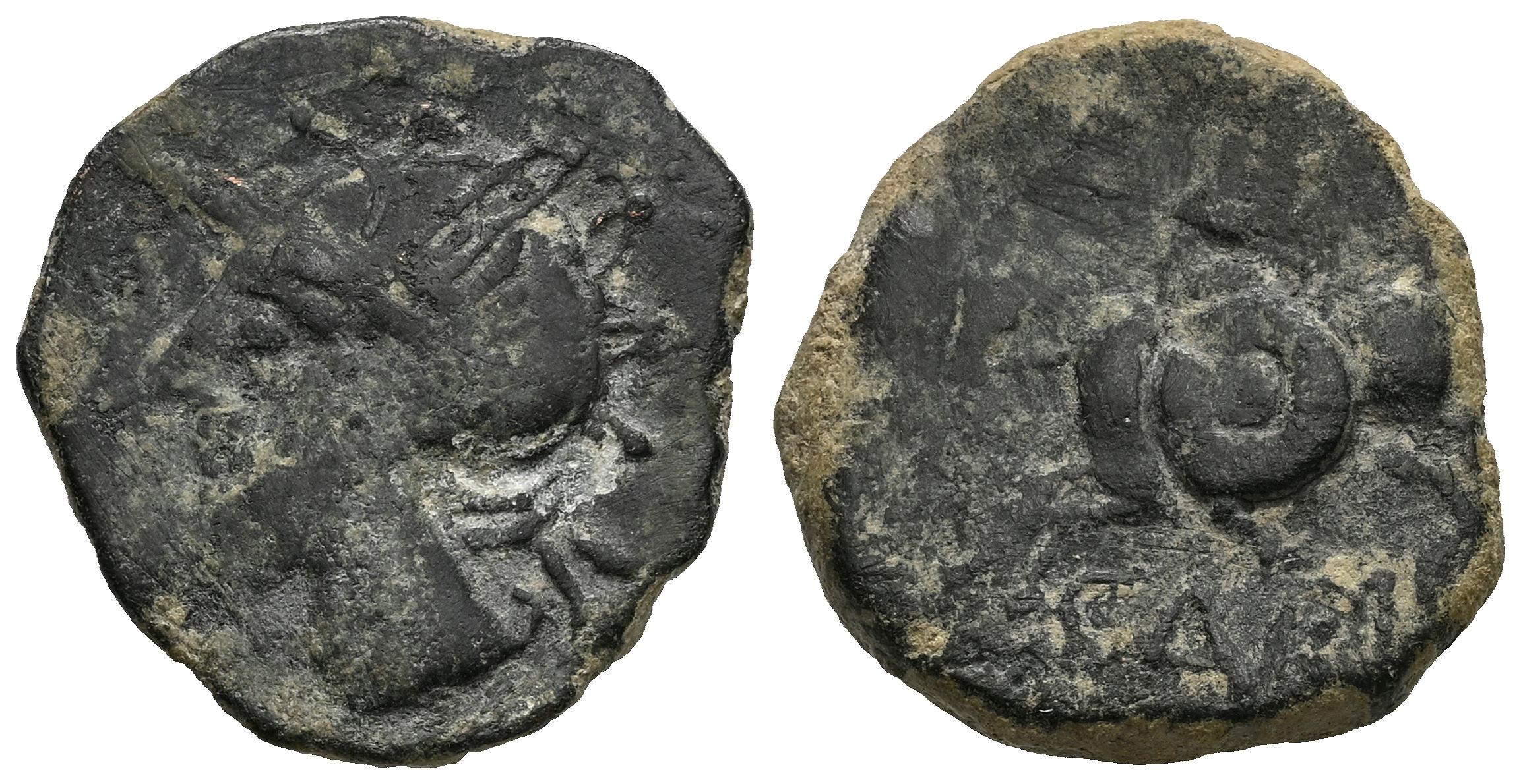 Carisa. Half unit. 50 BC. Bornos (Cádiz). (Abh-451). (MIB-194/09a). Anv.: Helmeted male head left. Rev.: Horseman left, holding round shield and spear, legend CARIS. Ae. 5,28 g. Almost VF. Est...45,00.