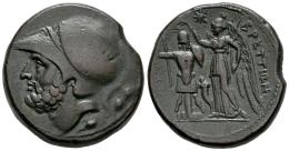 Bruttium. The Brettii. Didrachm. 214-211 BC. (HN Italy-1975). (Sng Ans-30/3). (Hgc-1, 1361). Anv.: Head of Ares to left, wearing crested Corinthian helmet decorated with griffin; grain ear below, two pellets behind. Rev.: Nike standing to left, placing wreath on trophy to left and cradling palm in her left arm; cornucopiae between, BPETTIΩN downwards to right. Ae. 16,65 g. VF/Choice VF. Est...120,00.