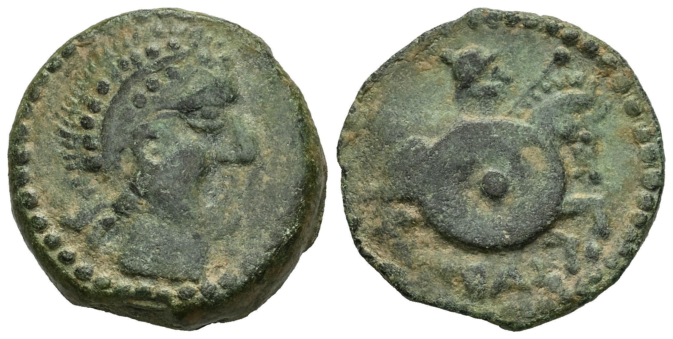 Carisa. Half unit. 50 BC. Bornos (Cádiz). (Abh-Unlisted). (MIB-194/03). (Acip-2514). Anv.: Laureate male head right. Rev.: Horseman right, holding round shield and spear, retrograde legend ƧIЯAϽ below. Ae. 5,11 g. Choice VF. Est...100,00.