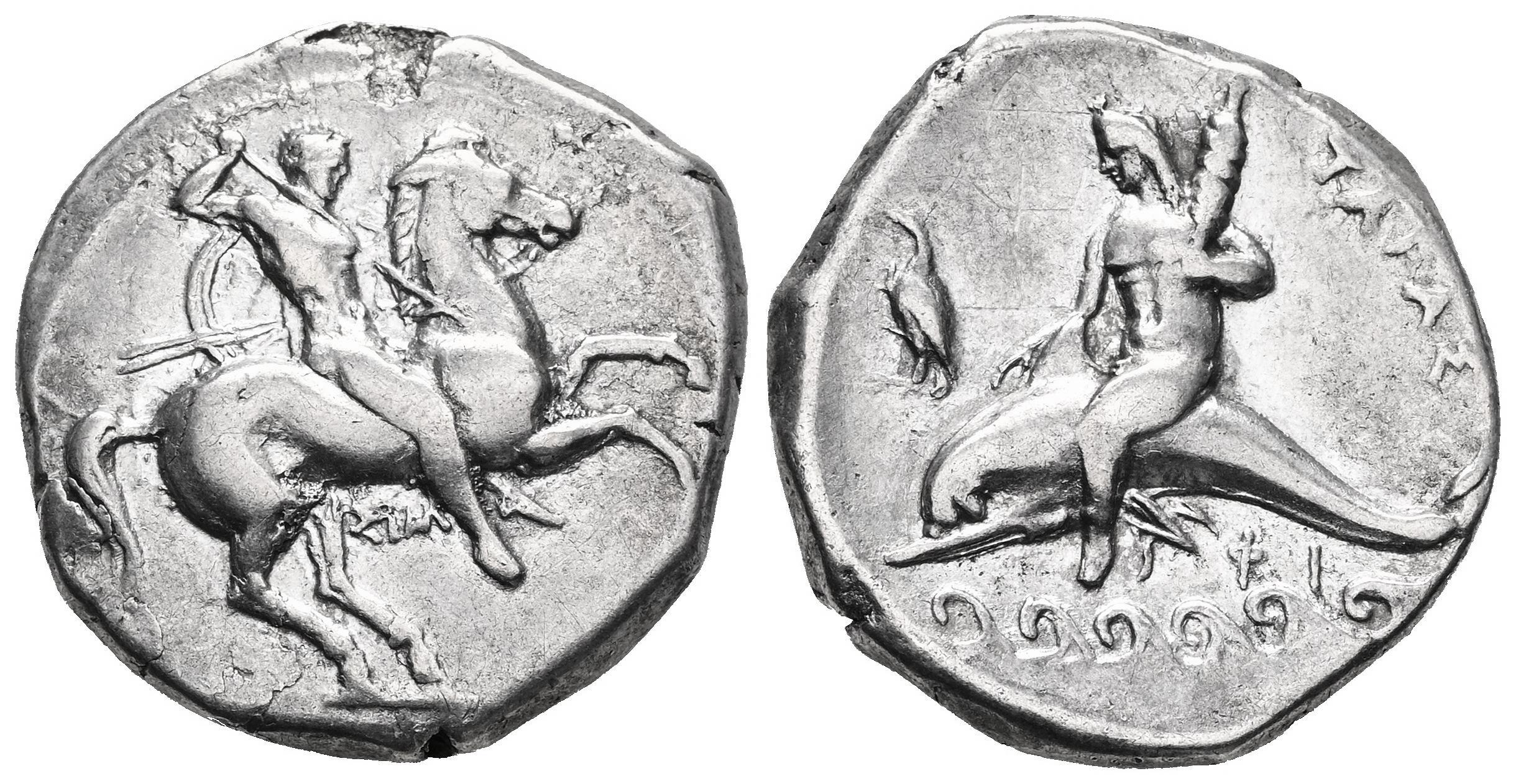 Calabria. Tarentum. Nomos. 302-290 BC. (Vlasto-573). (HN Italy-933). (SNG Ans-980). Anv.: Warrior on horseback to right, holding round shield, two lances, and spear; ΣIM below. Rev.: Taras seated astride dolphin to left, holding spindle over left shoulder; before, eagle standing right, TAPAΣ behind, ΦI and waves below. Ag. 7,73 g. Graffiti on reverse. Choice VF. Est...450,00.