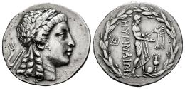 Aiolis. Myrina. Tetradrachm. 155-145 BC. Stephanophoric type. (Sacks-24). (Sng Cop-223 var.). Anv.: Laureate head of Apollo to right. Rev.: Apollo Grynios standing to right, holding phiale in right hand, filleted laurel branch in left; monogram and MYPINAIΩN to left, omphalos and amphora at feet; all within laurel wreath. Ag. 15,98 g. Choice VF. Est...1000,00.