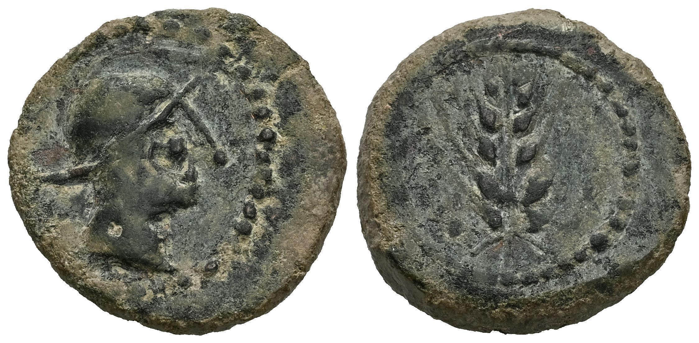 Carmo. Cuadrante. 80 BC. Carmona (Sevilla). (Abh-472). (MIB-198/08). (Acip-2385). Anv.: Helmeted male head right. Rev.: Ear of corn, three pellets to the left. Ae. 4,69 g. Very scarce. VF. Est...100,00.