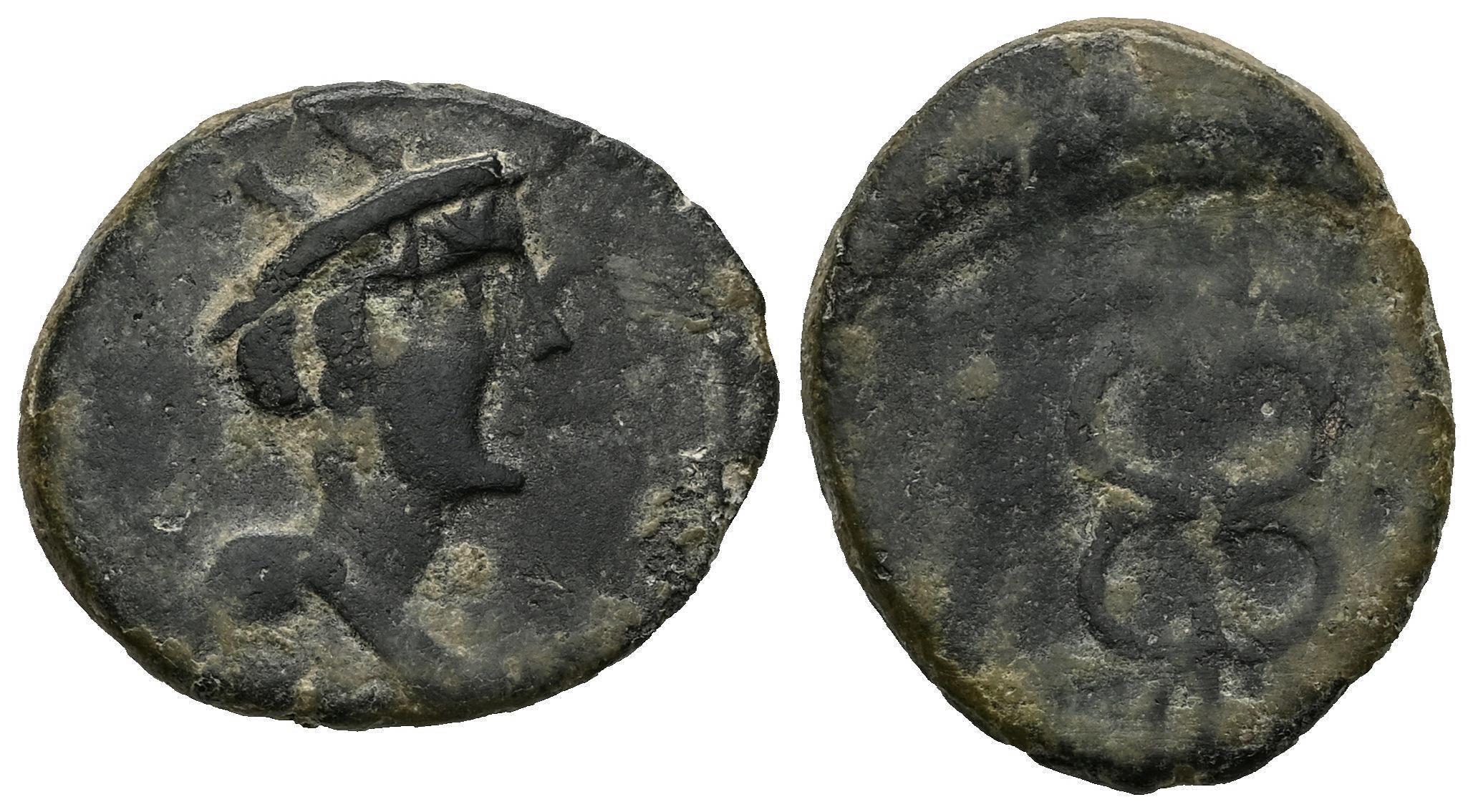 Carmo. Cuadrante. 80 BC. Carmona (Sevilla). (Abh-473A). (MIB-198/13). (Acip-2392). Anv.: Head of Mercury right. Rev.: Caduceus, three pellets to the right. Ae. 3,38 g. Almost VF/Choice F. Est...45,00.