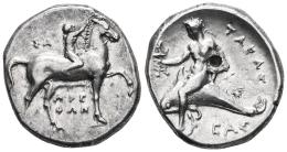 Calabria. Tarentum. Nomos. 302-280 BC. (Vlasto-666). (HN Italy-957 corr.). (Hgc-1, 813). Anv.: Youth on horseback to right, holding reins and crowning horse; ΣA to left, APE-ΘΩN in two lines below. Rev.: Taras riding dolphin to left, holding tripod; TAPAΣ behind, CAΣ below. Ag. 7,90 g. Punch mark on reverse. Almost XF/Choice VF. Est...400,00.