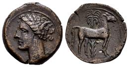 Hispanic-Carthaginian Coinage. 1/2 calco. 220-215 BC. Cartagena (Murcia). (Abh-507). (MAA-18). (Sng Cop-109/19). Anv.: Head of Tanit left. Rev.: Horse standing right, palm behind, pellet before horse. Ae. 2,95 g. Choice VF. Est...100,00.