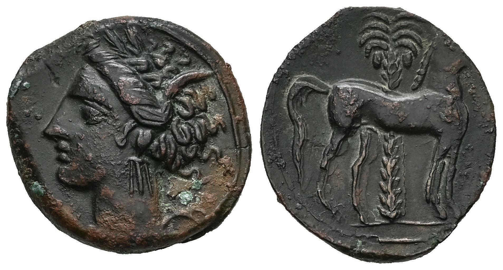 Hispanic-Carthaginian Coinage. 1/2 calco. 220-215 BC. Cartagena (Murcia). (Abh-507). (MAA-18). (Sng Cop-109/19). Anv.: Head of Tanit left. Rev.: Horse standing right, palm behind, pellet before horse. Ae. 3,00 g. Slight rust on obverse. Choice VF. Est...60,00.