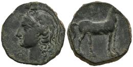 Hispanic-Carthaginian Coinage. Chalkous. 220-215 BC. Cartagena (Murcia). (Abh-526). (MIB-8/45). (Acip-592). Anv.: Head of Athena left, phoenician letter yod. Rev.: Horse standing right. Ae. 11,24 g. Choice VF. Est...150,00.