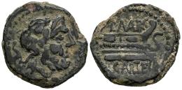 Carteia. Half unit. 80-20 BC. San Roque (Cadiz). (Abh-622). (MIB-200/11a). (Acip-2557). Anv.: Head of Jupiter right, S behind. Rev.: Prow of ship right, L. MARC. above and CARTEIA below, front S. Ae. 9,17 g. Scarce. VF/Choice VF. Est...80,00.