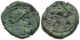 Carteia. Half unit. 80-20 BC. San Roque (Cadiz). (Abh-639). (MIB-200/29 var.). (Acip-2557 var.). Anv.: Head of Jupiter right. Rev.: Dolphin left, retrograde and lying S above, CARTEIA below. Ae. 5,57 g. Legend on the reverse in a straight line. Very rare. Choice F. Est...70,00.