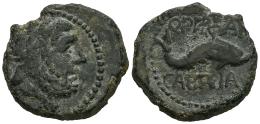 Carteia. Half unit. 80-20 BC. San Roque (Cadiz). (Abh-645). (MIB-200/16b). (Acip-2564). Anv.: Head of Jupiter right, S behind. Rev.: Dolphin right, Q. PEDECAI. above and CARTEIA below. Ae. 10,59 g. Almost VF/VF. Est...70,00.