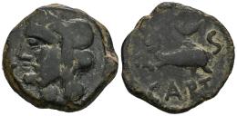 Carteia. Half unit. 80-20 BC. San Roque (Cadiz). (Abh-650). (MIB-200/04a). (Acip-2547). Anv.: Head of Jupiter left. Rev.: Dolphin right, crescent above, S before and CART below. Ae. 10,88 g. Scarce. Almost VF. Est...90,00.